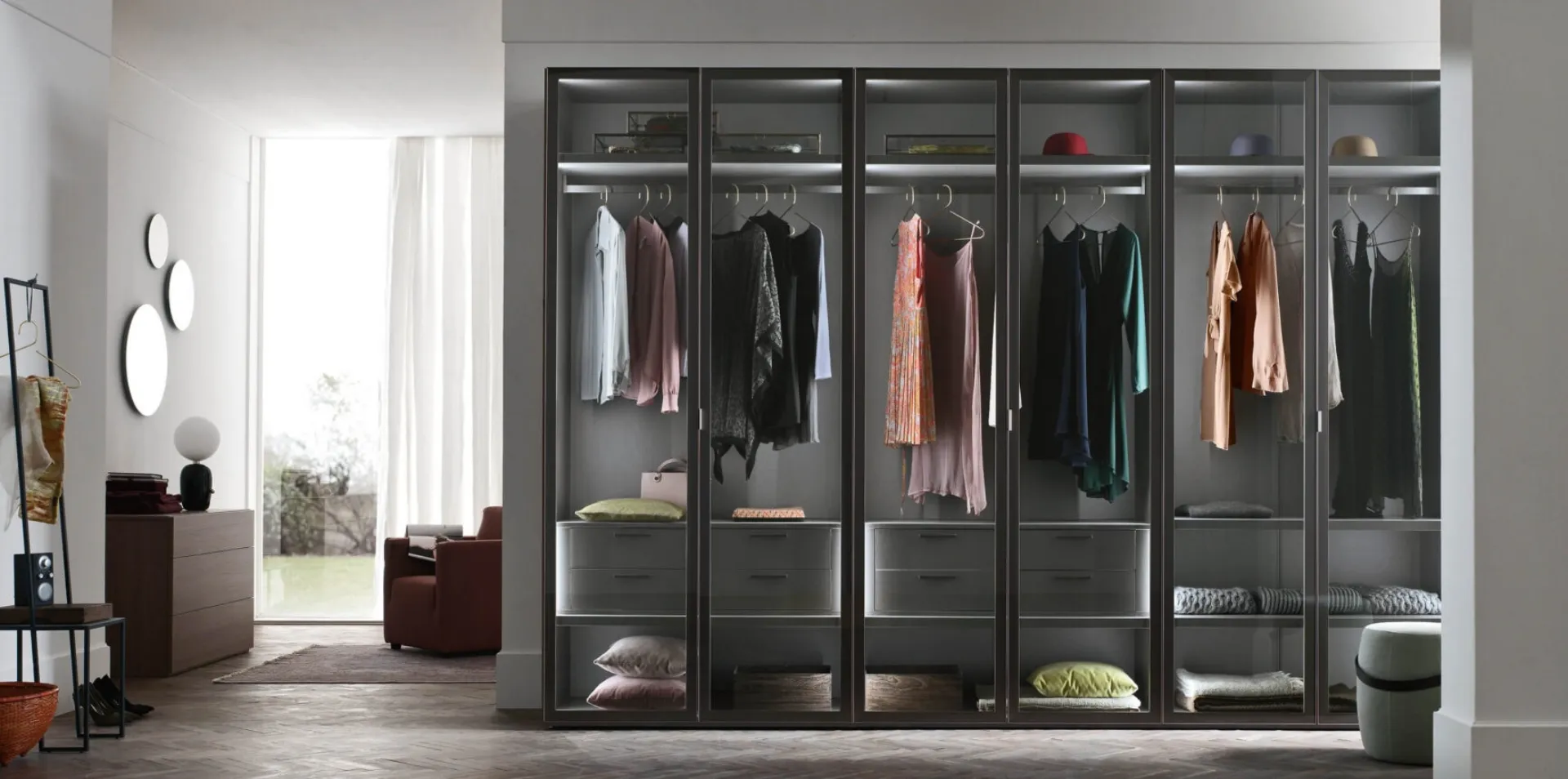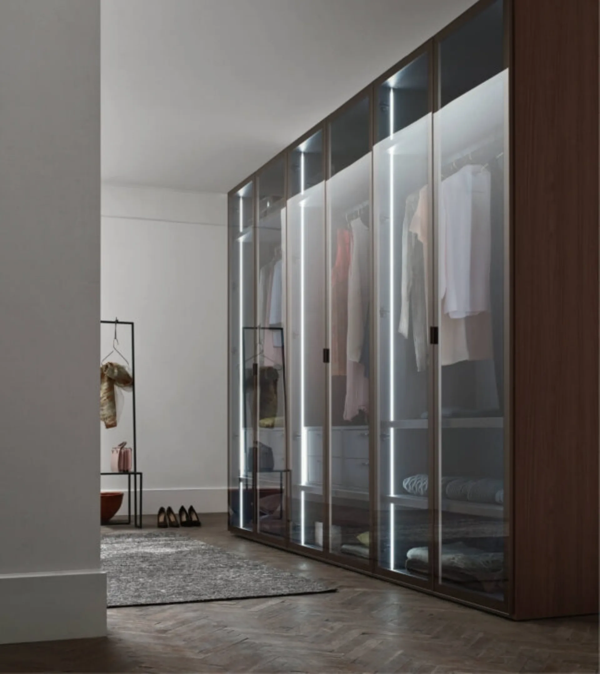 Gli Armadi a muro con ante battenti sono componenti immancabili nella zona notte, per renderla arredata al meglio, pratica e completa di tutto. Per ammobiliare alla perfezione una stanza funzionale ed esteticamente gradevole, opta per le più belle soluzioni delle migliori marche, letti, armadi e comodini di alto contenuto estetico. Contattaci e ottieni informazioni sulla nostra collezione di Arredamento Casa: sarai in grado di completare la zona notte utilizzando una diversificata gamma di contenitori moderni, come l'armadio in vetro nell'immagine.