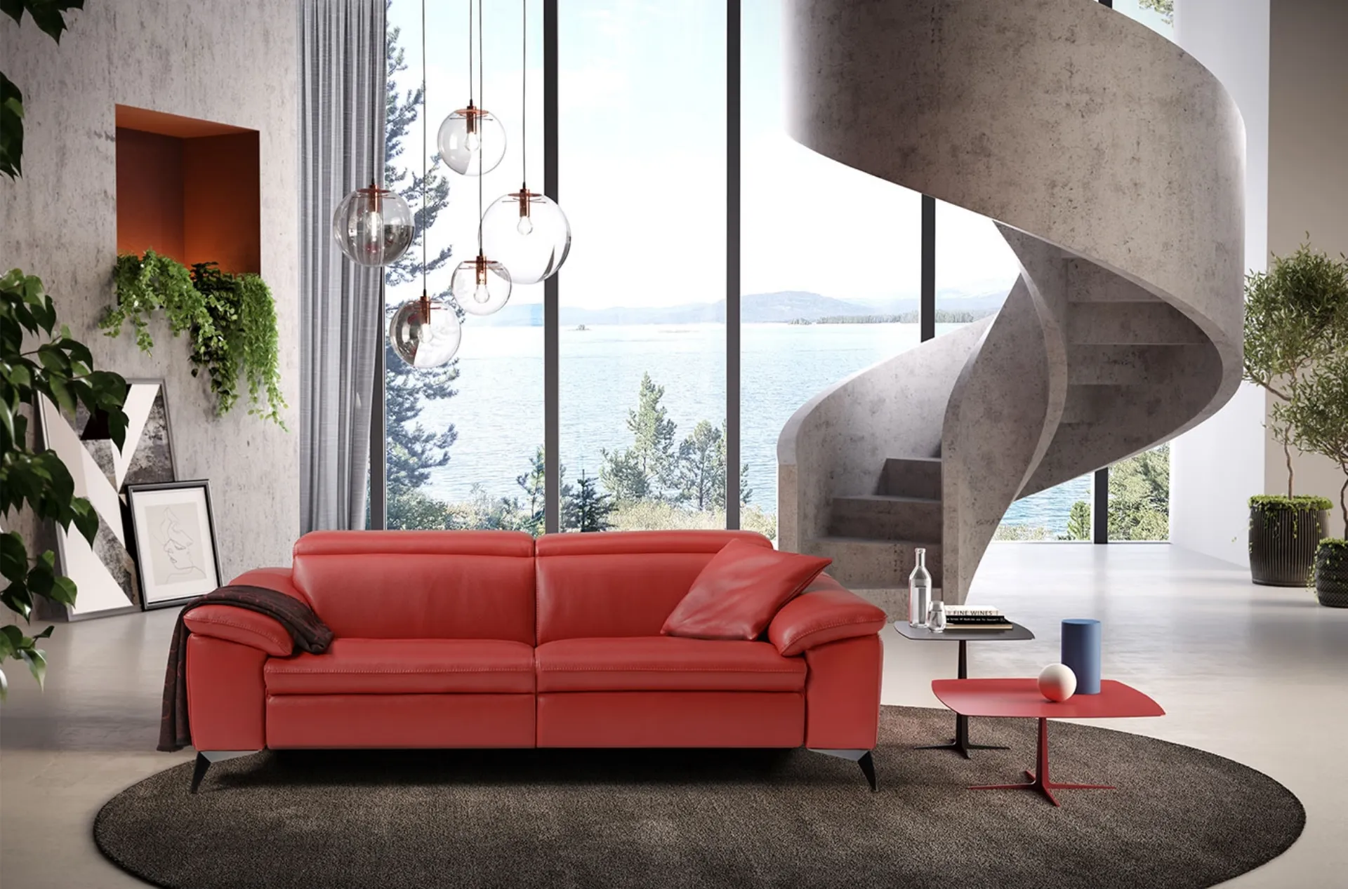 Divano rosso lineare minimal ed elegante, con piedini in metallo